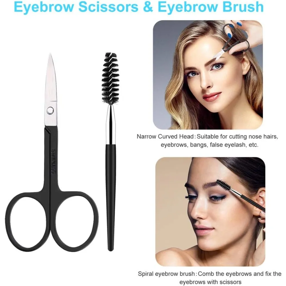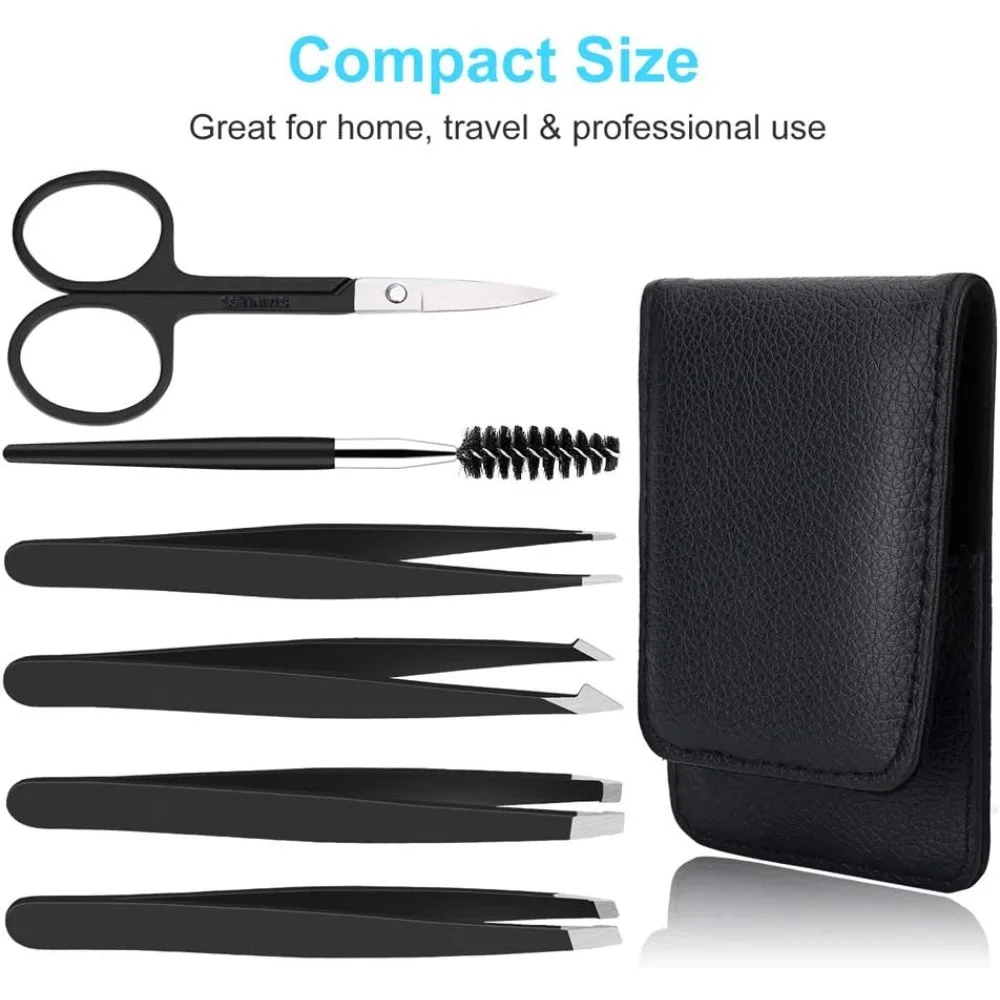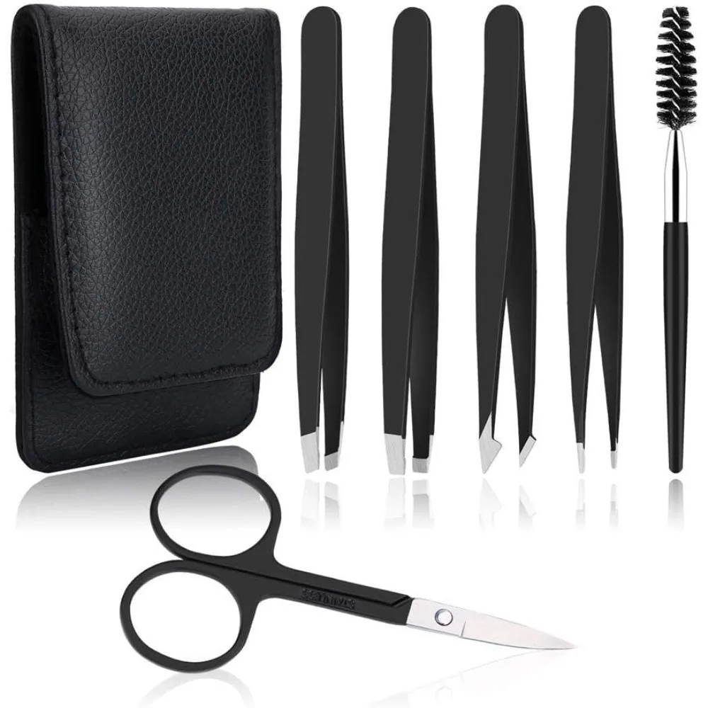 [6+1 Pcs] Tweezers Set: Our tweezer kit with 4 pcs tweezers, 1 pcs eyebrow brush, 1 pcs curved scissors, 1 pcs leather travel case, these tweezers are the best choice for our daily eyebrow trimming