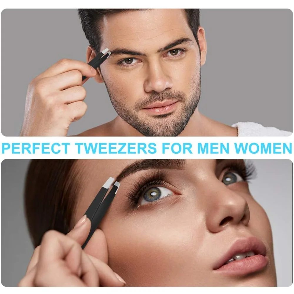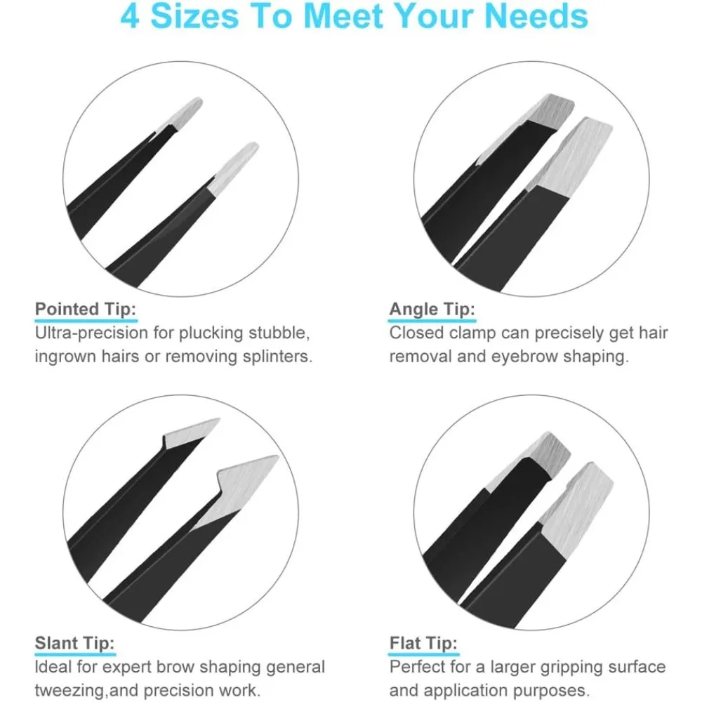 Outstanding Material: Our tweezer set are made of premium stainless steel, durable, easy to clean, this eyebrow tweezer set contains: slant, pointed, pointed slant, flat tweezers, eyebrow scissors and eyebrow brush, perfect choice to handle a variety of jobs