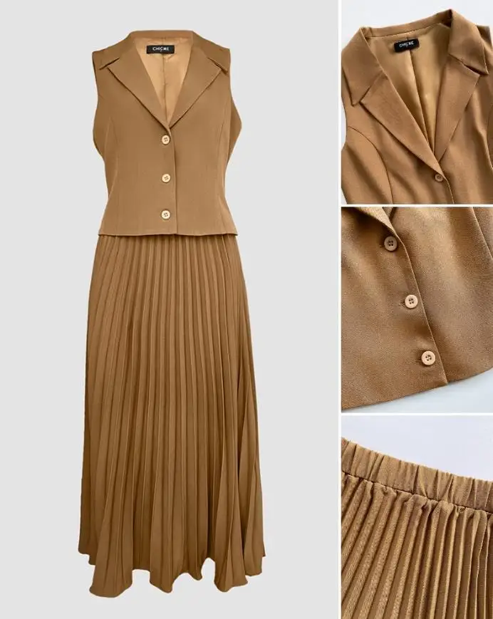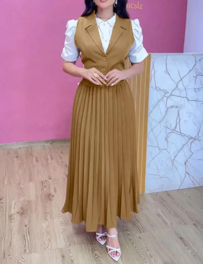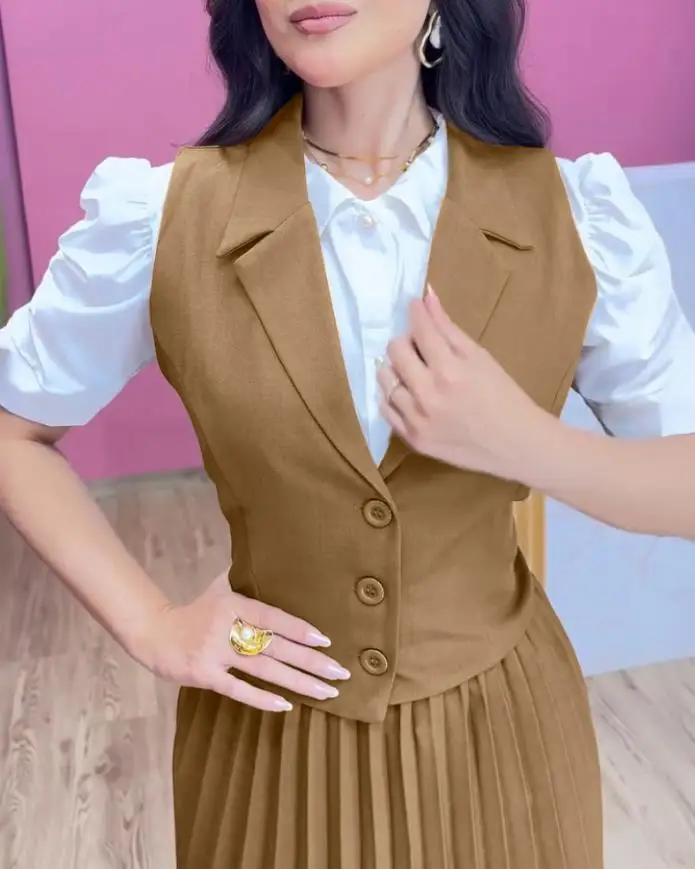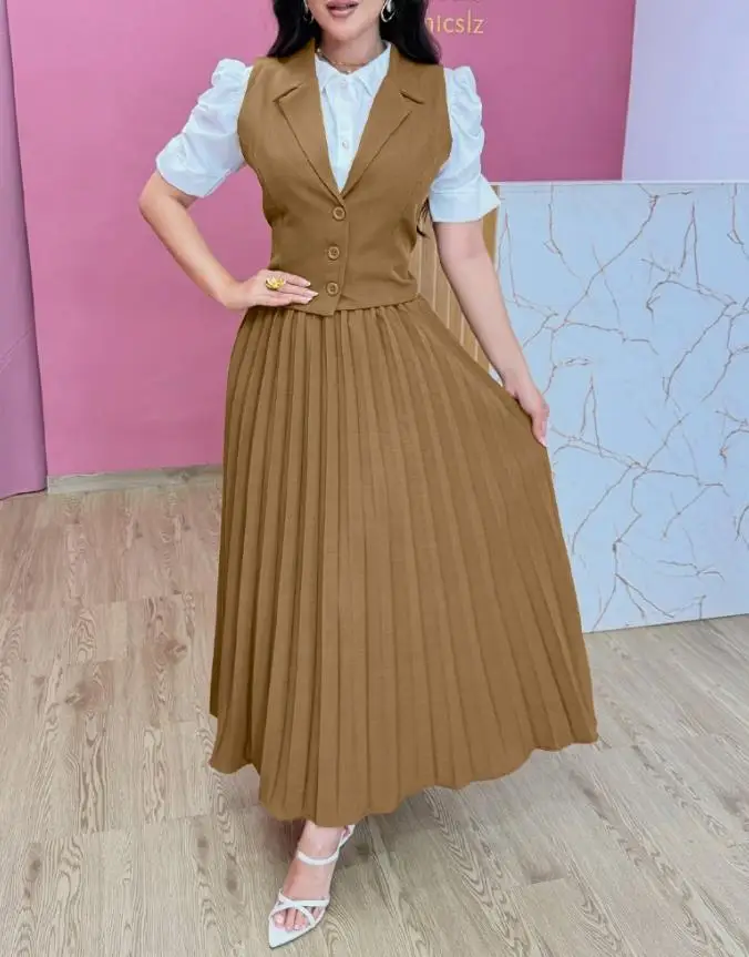 2025 Elegant 2 Piece Sets Womens Outfits Turn-Down Collar Sleeveless Button Vest Top and Casual Pleated Skirt Sets
