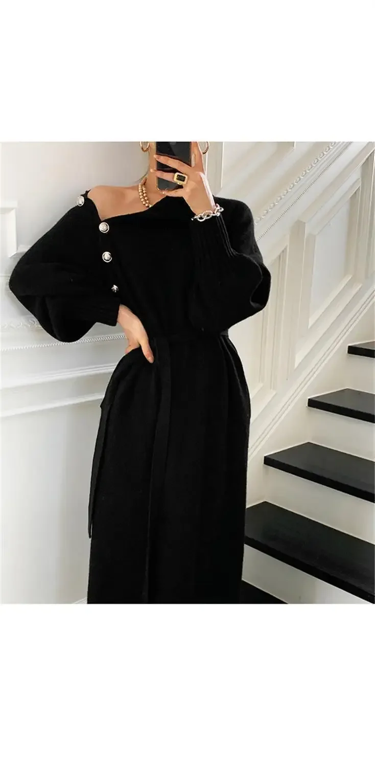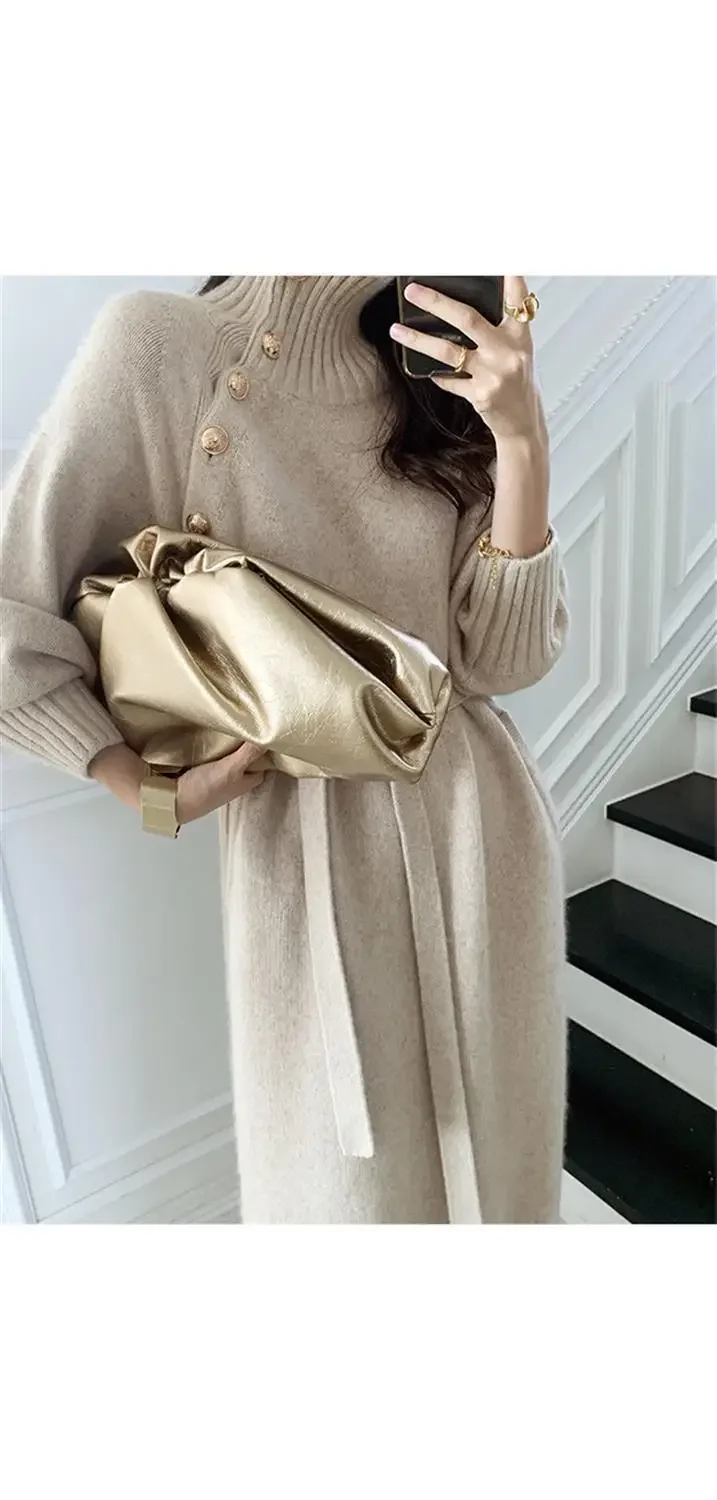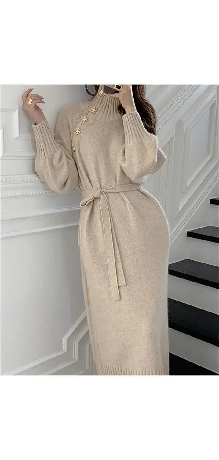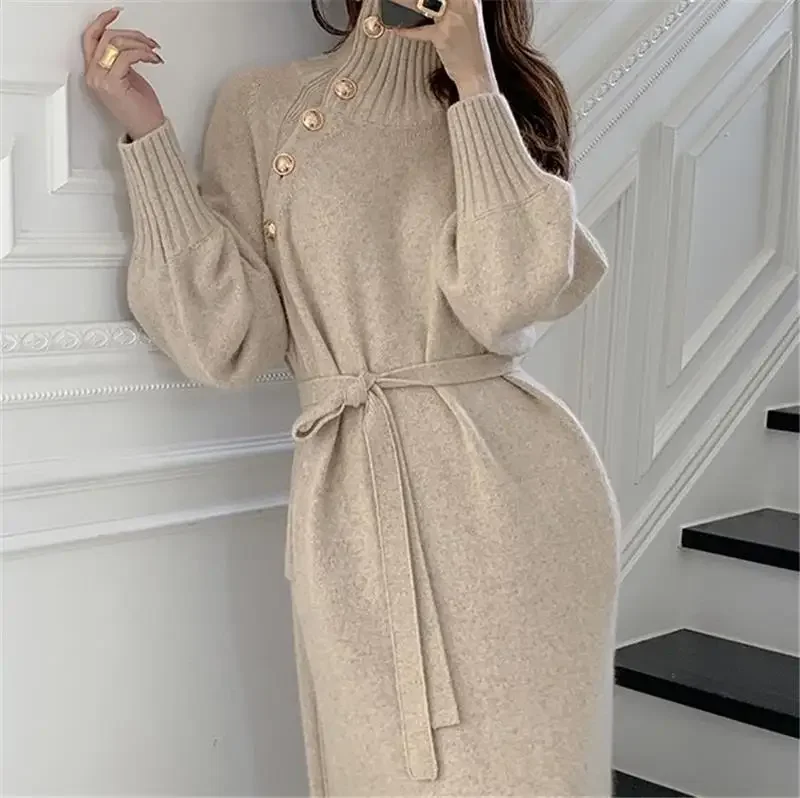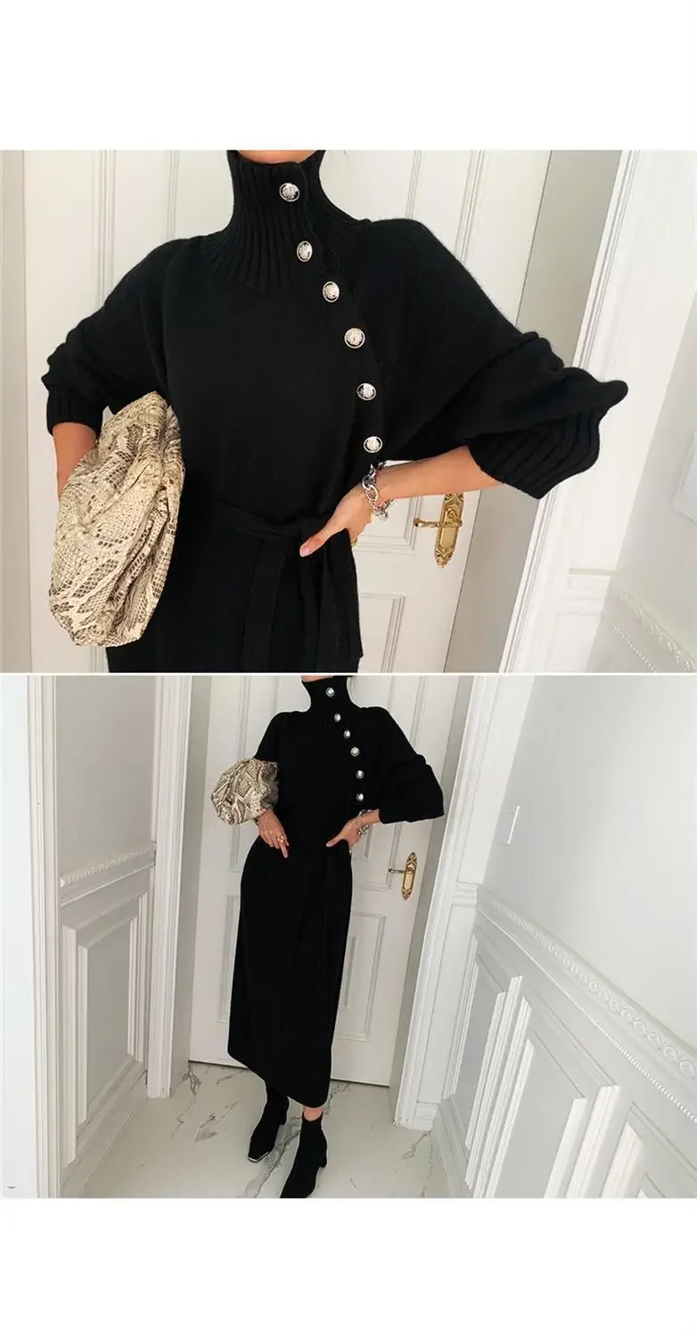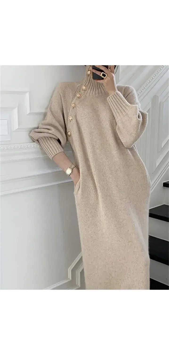 Elegant Knitted Dress Women's Autumn Winter High Collar Long Dress Base Layer Dress Retro Button Fashionable Women's Dress
