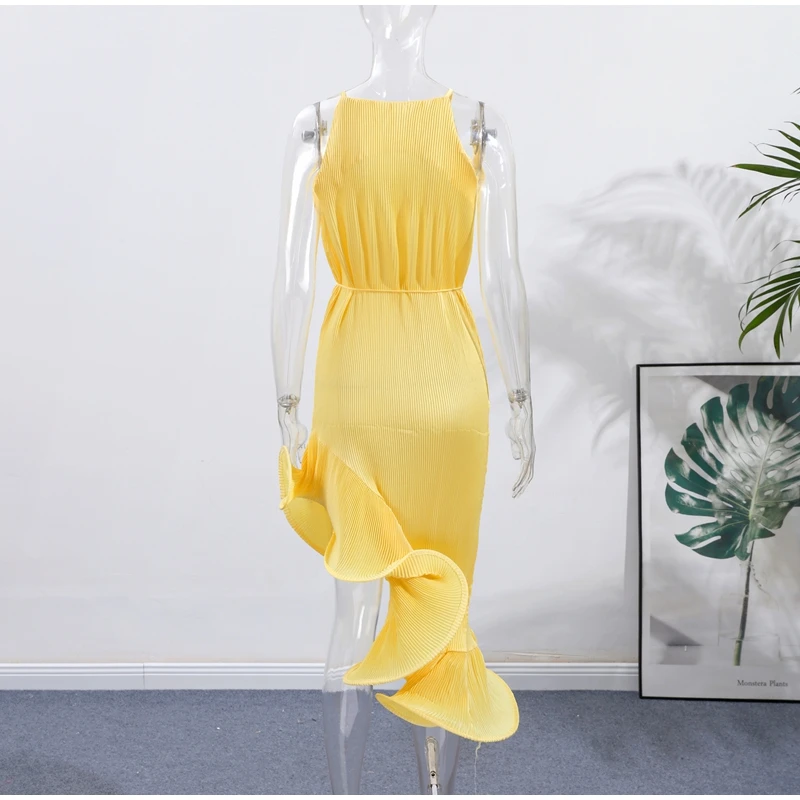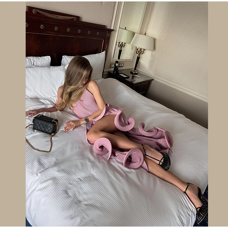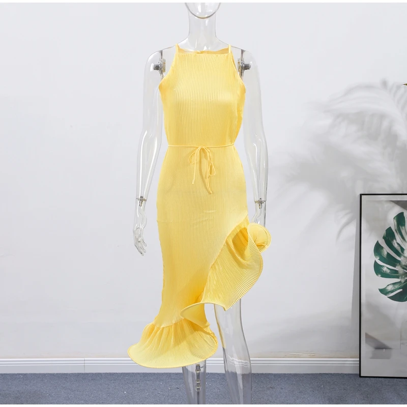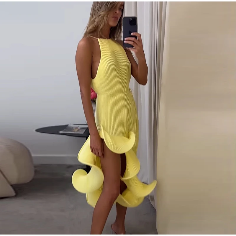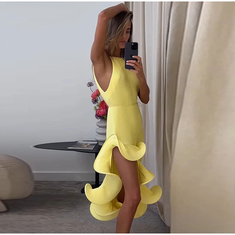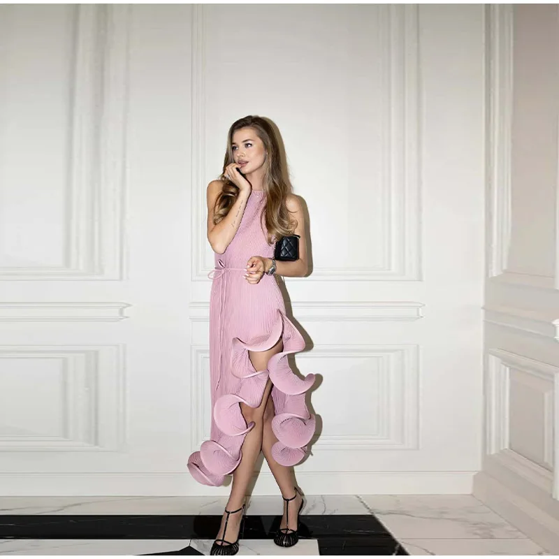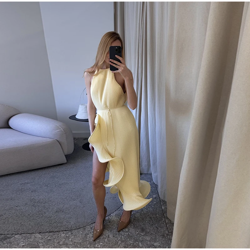 Irregular Flounce Lace Up Long Dress Woman Sleeveless Solid Color Pleated Straight Dresses Chic Elegant Women's Summer New Dress