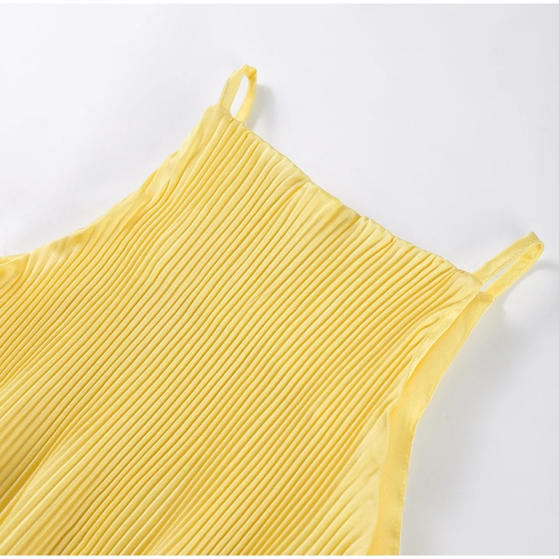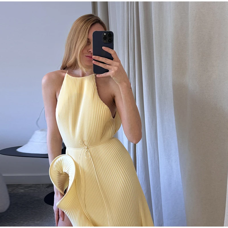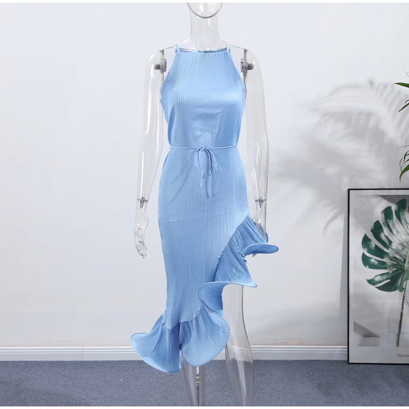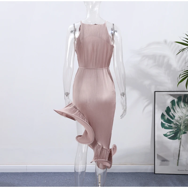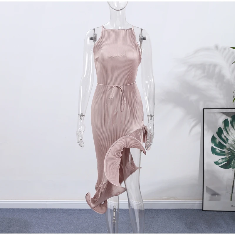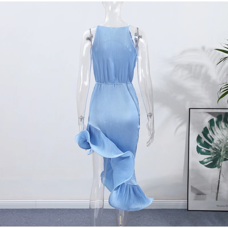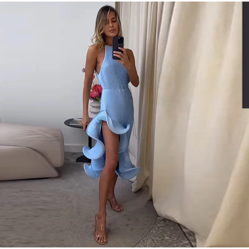 Irregular Flounce Lace Up Long Dress Woman Sleeveless Solid Color Pleated Straight Dresses Chic Elegant Women's Summer New Dress